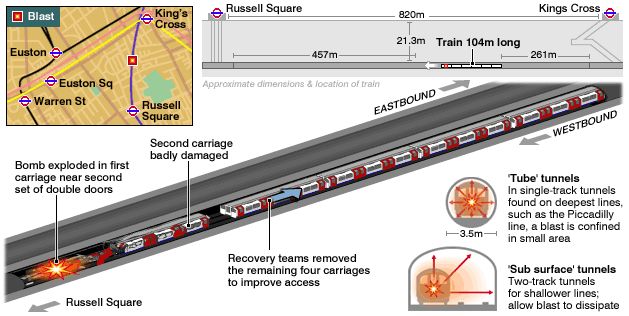 At 0850 a bomb exploded on Piccadilly line train number 311 travelling south from King’s Cross to Russell Square. Twenty six people plus the bomber were killed. More than 340 were injured. The trapped passengers were rescued by members of the police and fire brigade approaching respectively from Russell Square and Kings Cross.